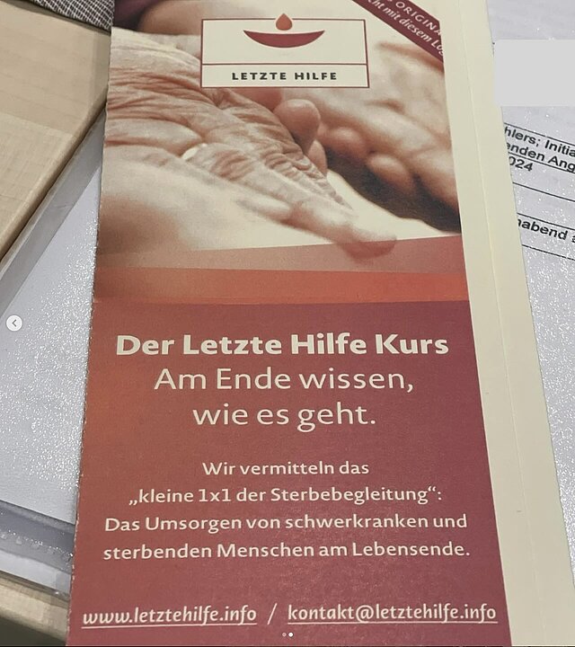 Die Initiative „Letzte Hilfe“ wendet sich an Bürgerinnen und Bürger, die wissen möchten, was sie für ihre Lieben am Ende des Lebens tun können. Wissen um letzte Hilfe und Umsorgung von schwerkranken Menschen sollte zum Allgemeinwissen werden.