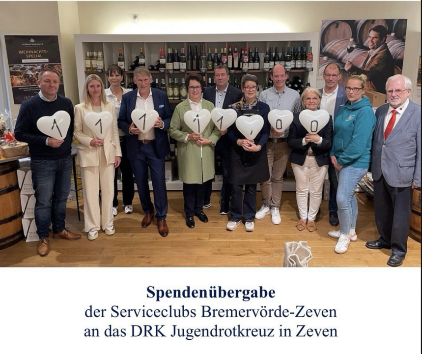 Der Erlös vom diesjährigen Weinfest der sechs Serviceclubs war ein großer Erfolg. Die Spende über 11.111.- € wurde an Frau Maya Haker (JRK) und Herrn Bernd Kampa (DRK Zeven) im Weinhaus L. von Kapff von den Vertreterinnen und Vertreter des Lions Zeven, Rotary Bremervörde-Zeven, Kiwanis Oste-Wümme, Rotaract, Inner Wheel Nordheide und Soroptimist International (SI) Bremervörde-Zeven überreicht.
