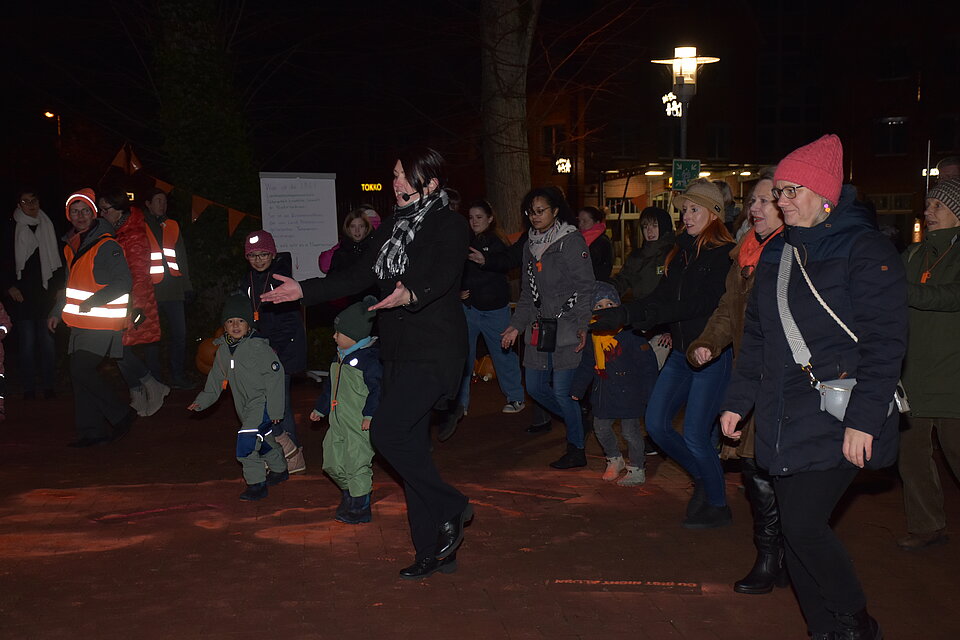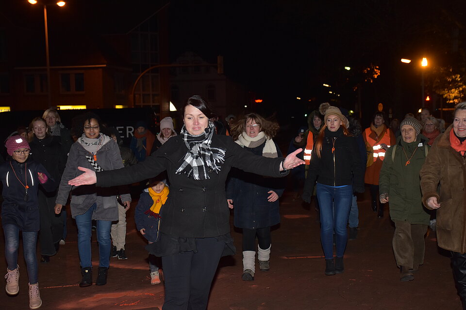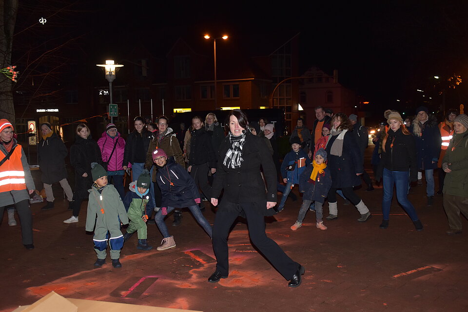 Daniela Behrens von der Tanzschule "Danceworks" animierte die versammelte Teilnehmerschar schon einmal, für den Aktionstag "One Billion Rising" am 14. Februar den Tanz "Break the Chain" einzuüben. Auch in Zeven wird an diesem Tag wie an vielen Orten weltweit derselbe Tanz getanzt: als weltweite Demonstration gegen Gewalt an Frauen und Mädchen.